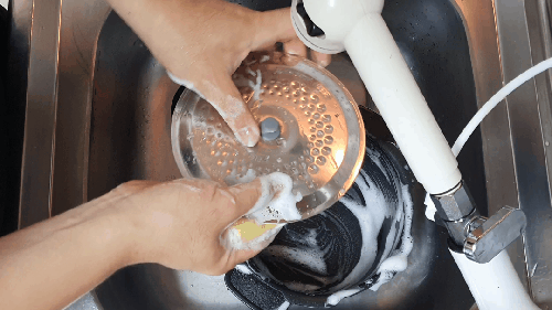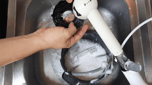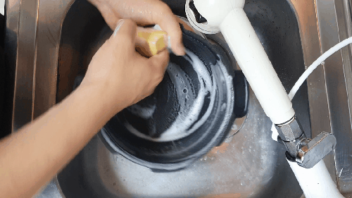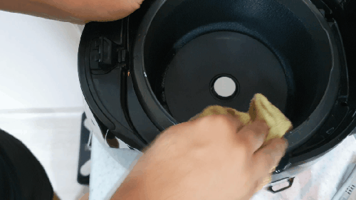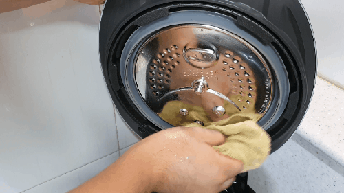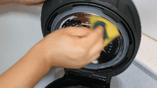 압력밥솥 뚜껑 쪽을 보면 잔재가 많이 묻어있는 곳을 볼 수 있습니다. 이곳은 스펀지 부분으로 세제를 조금만 묻혀 씻어주고, 마무리는 스펀지를 깨끗하게 씻고 쥐어짜서 두세 번 닦아냅니다.