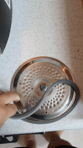 스팀 나오는 쪽에 소프트스팀캡이라고 있습니다. 이는 내부에서 나오는 증기에서 나오는 응축수(?)를 후면 수통으로 넘겨주는 역할을 하는데, 오래 청소하지 않으면 이곳까지 지저분하므로 분해를 해버립니다. 내부 디스크는 중간에 고무패킹이 있는데 튀어나온 것을 잡고 힘줘서 잡아당기면 빠집니다. 역시 밥 할 때 집접적으로 스팀과 잔재가 묻는 곳이라 같이 청소해 주는 것이 좋습니다.