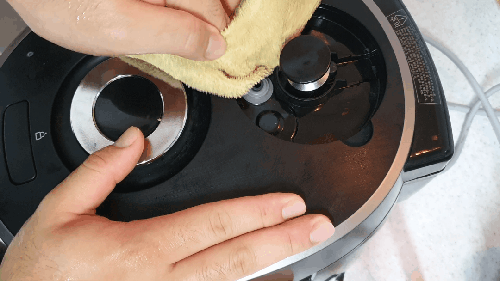 그리고 내부 솥 아래, 상부 소프트 스팀캡 후면부 물통 쪽도 닦아냅니다.