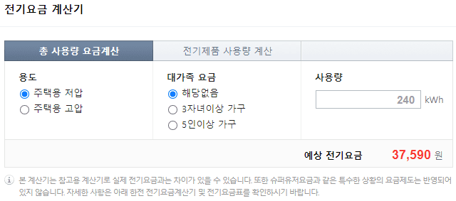 약 38,000원이 나오게 됩니다. 위 계산은 각 세대의 월간 전기 사용구간에 따라 달라지므로 비교했을 때 이 정도 차이가 나는구나라고 참고용으로만 사용하시면 되겠습니다.