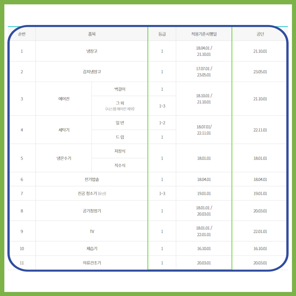 에너지소비효율표에 나오며 적용기준시행일은 표 하단 작은 글씨로 적혀있습니다. 신청하실 품목이 등급과 적용기준 시행일 모두 충족해야 합니다.