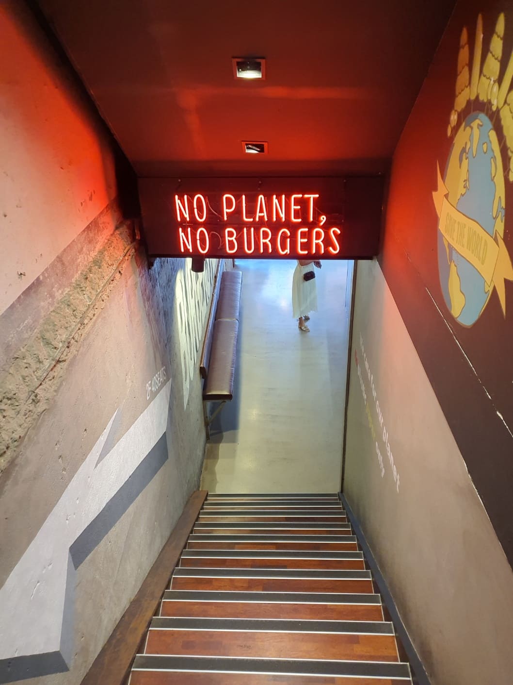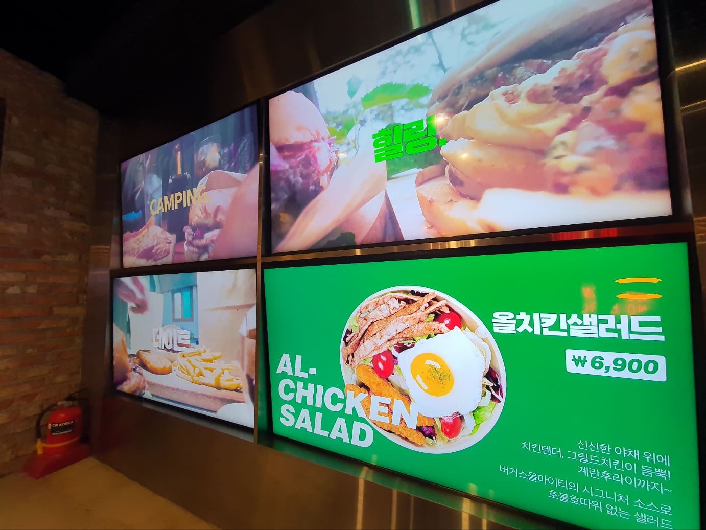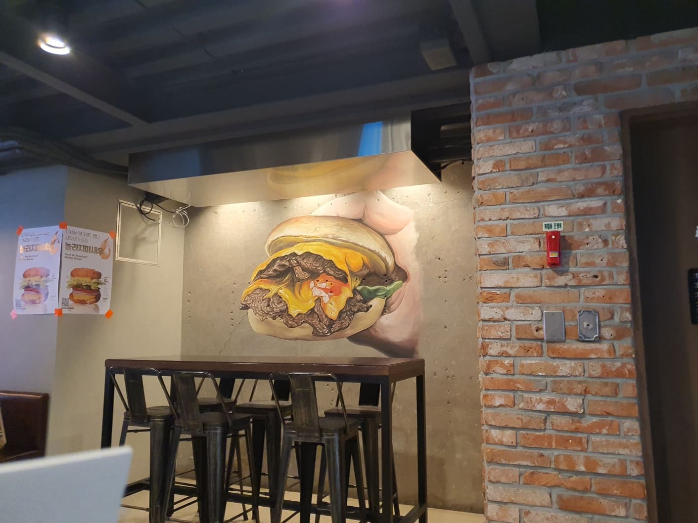 안을 보시면 다양한 색의 조명과 벽화가 있습니다. 그리고 계단을 돌면 나오는 4개의 모니터에 아주 맛좋아 보이는 햄버거 제작영상까지 재생되고 있었습니다.