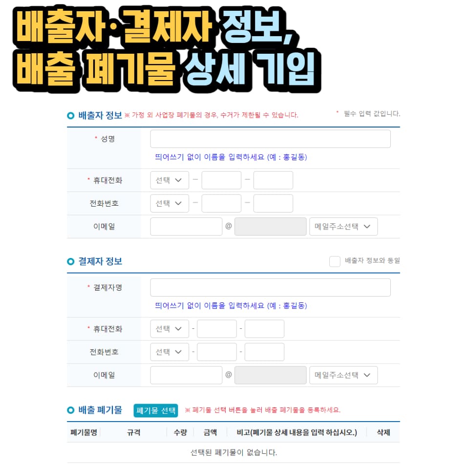 아래 사진과 같이 각 구청 사이트로 접속하셔서 《폐기물》 이라는 단어를 검색하시면 아래와 같은 화면과 함께 신청 양식이 나올 겁니다.