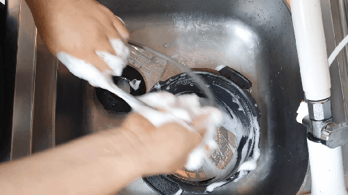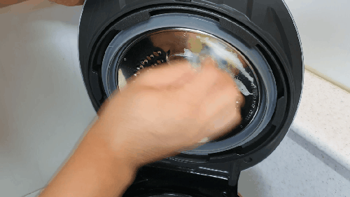 압력밥솥 뚜껑 쪽을 보면 잔재가 많이 묻어있는 곳을 볼 수 있습니다. 이곳은 스펀지 부분으로 세제를 조금만 묻혀 씻어주고, 마무리는 스펀지를 깨끗하게 씻고 쥐어짜서 두세 번 닦아냅니다.