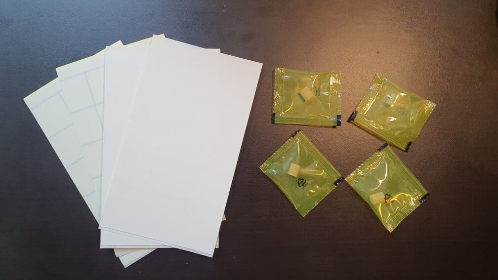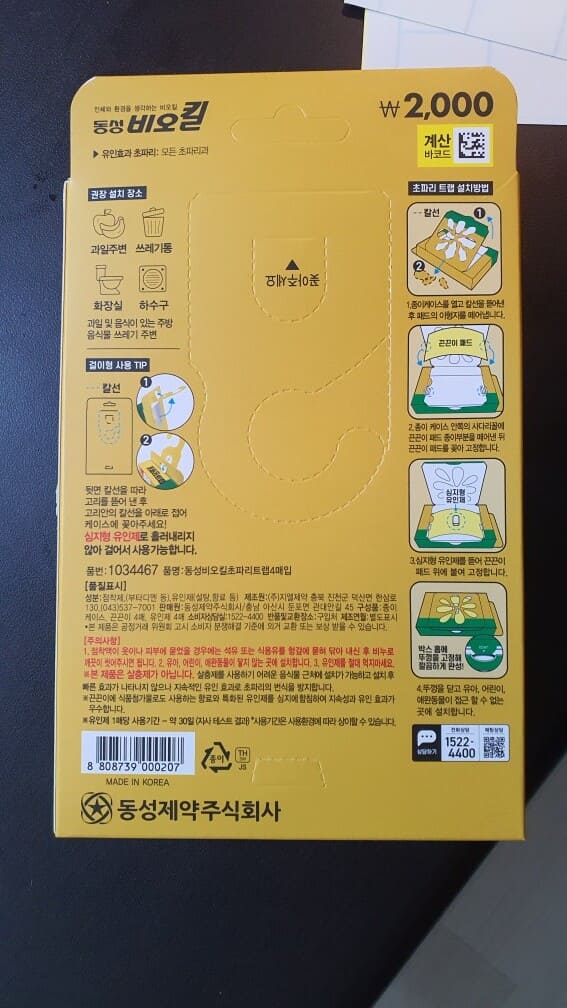 퇴치기(끈적이) 4장, 유도제 4개 들어있습니다. 이 퇴치기는 파스처럼 한쪽면을 떼면 끈적거려서 초파리가 도망치지 못하게 잡을 수 있습니다. 그리고 우측 유도제는 초파리들이 좋아하는 신냄새를 강하게 배출하여 초파리를 유도하는 역할을 합니다. 이 둘이 만난다면? 하단(후기) 사진을 보시면 실감하실겁니다.