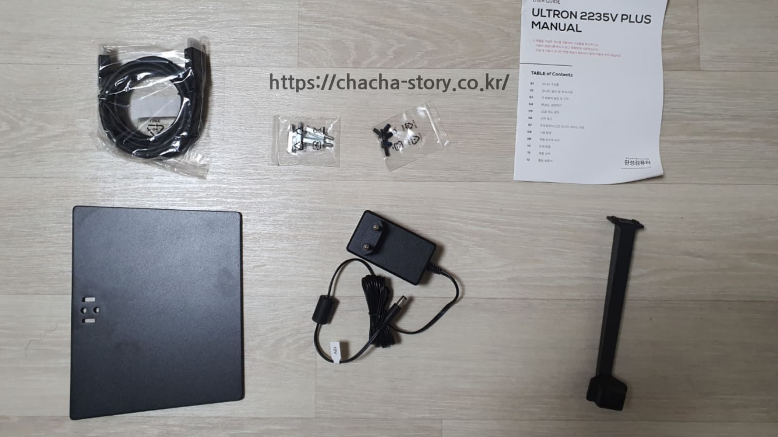 HDMI 선, 파워암 고정 핀 4EA, 받침대 피스 5EA(실제 4EA 필요), 파워선, 받침대, 매뉴얼