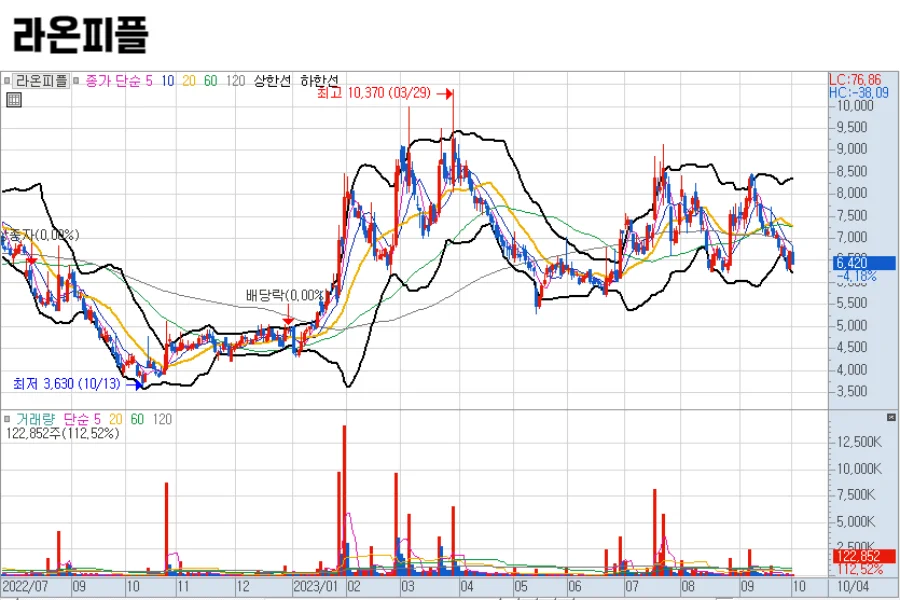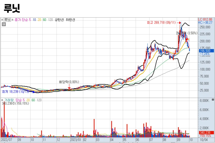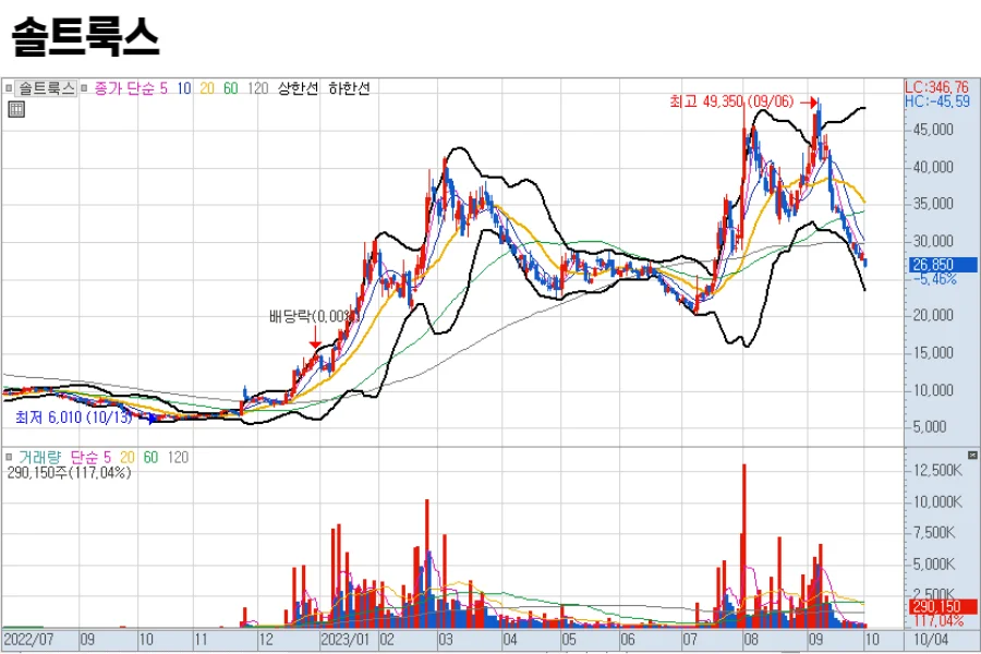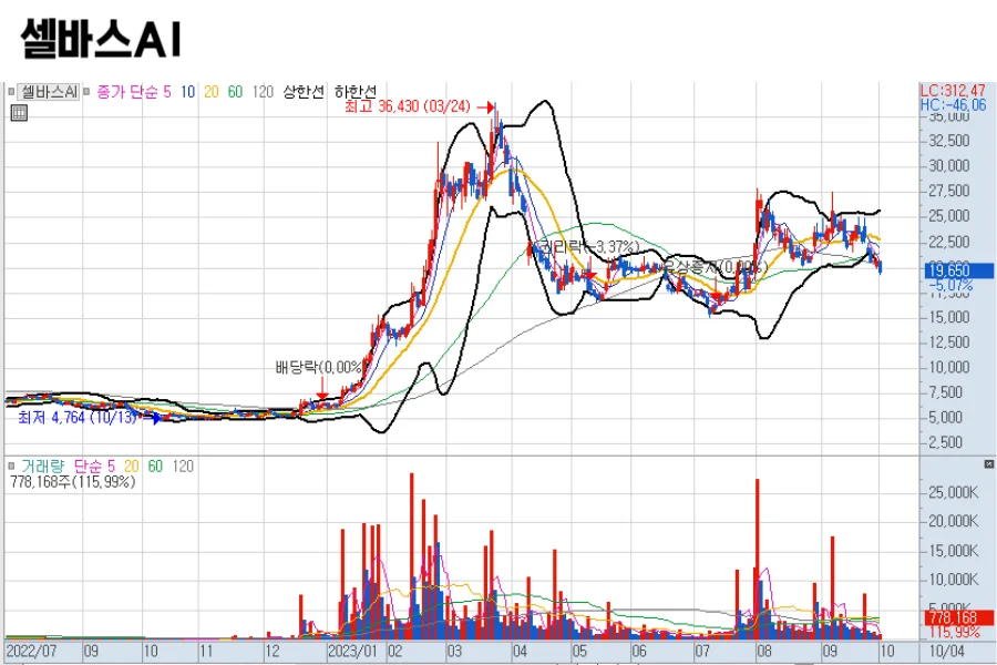 해당 주식은 이슈가 있기 전 9,000원에서 무려 최고 49,350까지 찍은 주식입니다. 거의 5배 이상이죠. 이런 주식에는 쉽게 덤비기 힘드실 겁니다. 만약에 기술적으로 분석하고자 볼린저밴드(상/하 검은선)를 보면 최근 볼린져를 벗어나면 하락하고, 볼린저 하단에 닿으려고 하면 상승하는 테크닉 그대로 진행되고 있습니다. 현재는 아예 볼린저가 꺾이면서 하향하고 있지만요.