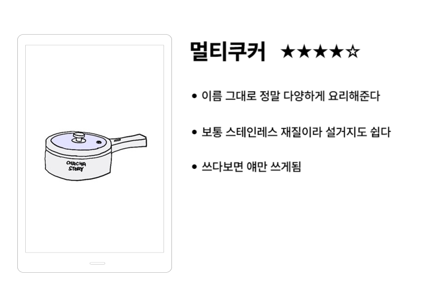 멀티쿠커가 뭐고? 라고 하실 분도 계시겠지만, 익히 알고 계신 것입니다. 전기냄비라고도 많이 부르는데, 자취방에서 간단히 라면 먹거나 계란 삶을 때 유용합니다. 저는 사실 여기다 고기까지 구워봤는데, 열이 좀 약하긴 해도 가능하긴 하더라고요. 정말 멀티 쿠커라는 걸 알게 됐습니다. 이 작은 게 작은 집에서 만능 역할을 해주니 이보다 더 좋을 순 없겠네요. 하지만 생활필수품이라고는 생각하지 않기 때문에 별점은 한 개 내렸습니다.