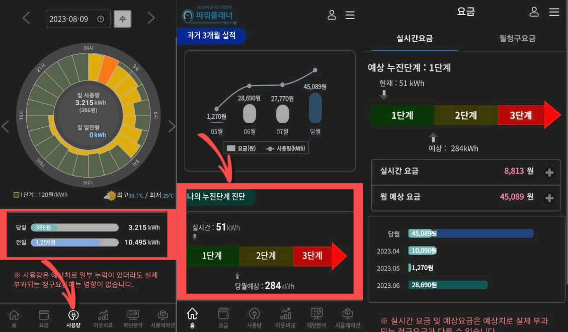 4. 실시간 요금 및 사용량, 3개월 실적, 누진단계 진단, 사용 패턴분석, 이웃간 분석을 알 수 있습니다.